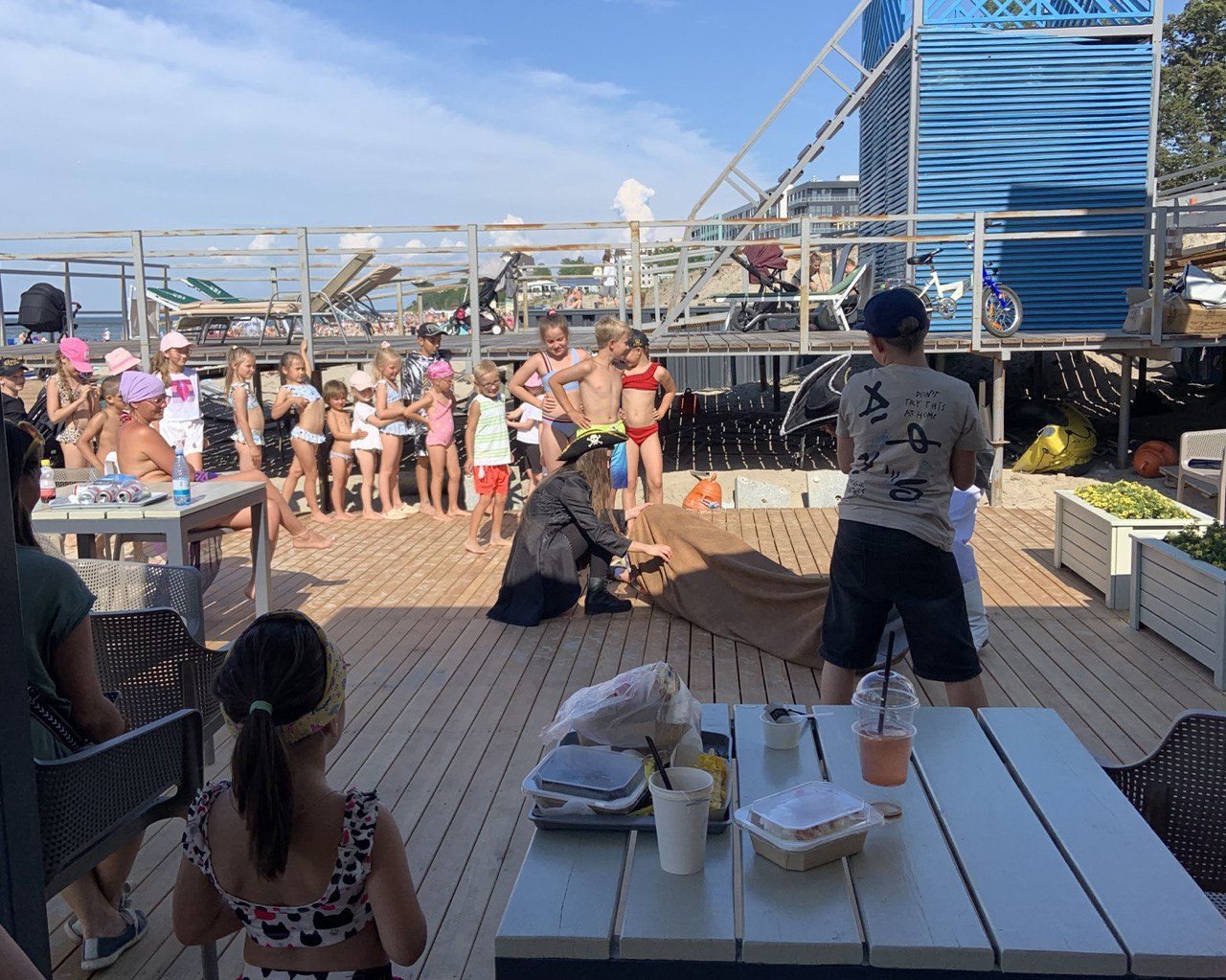 Конечной точкой прогулки на Запад может стать кафе «Гнездо». Где вы вместе с детьми можете пообедать, посмотреть, как ловят волну серферы или летают на парашютах скай-серферы. Как раз тут расположен серф-клуб. Здесь вы сможете увидеть легендарные песчаные дюны, где люди загорают даже ранней весной. Сможете понять, почему же они называются «Сковородки» (потому, что ветра там нет и всегда тепло).